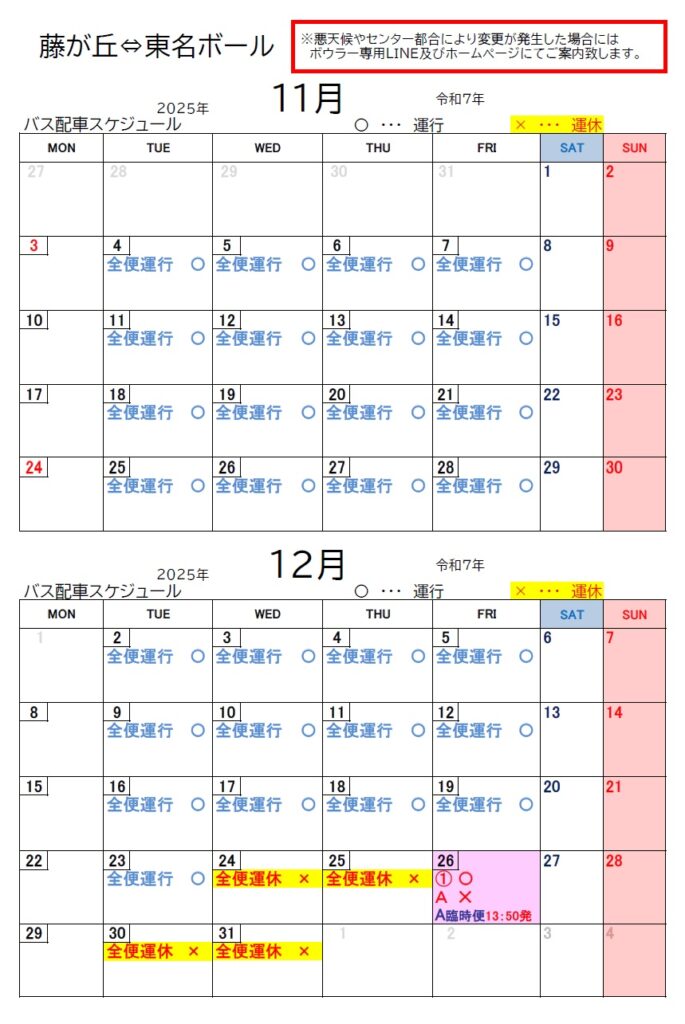 ●東名ボール⇔藤が丘 無料シャトルバス運行 2025.10.1| お知らせ 2025年2月より一部時刻の変更と廃止箇所がございますのでご注意下さい。運行スケジュールは下記をご確認下さい。 乗車人数が定員に達した場合は、ご乗車をお断りする場合がございます。 その他ご不明な点ございましたらお問い合わせください。 東名ボール 0561-21-6131 ※7月運行スケジュールが変更となりました(7/11更新)