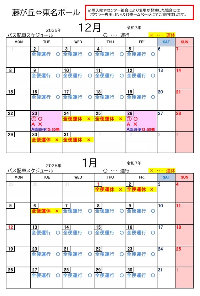 ●東名ボール⇔藤が丘 無料シャトルバス運行 2025.12.1| お知らせ 2025年2月より一部時刻の変更と廃止箇所がございますのでご注意下さい。運行スケジュールは下記をご確認下さい。 乗車人数が定員に達した場合は、ご乗車をお断りする場合がございます。 その他ご不明な点ございましたらお問い合わせください。 東名ボール 0561-21-6131 ※7月運行スケジュールが変更となりました(7/11更新)